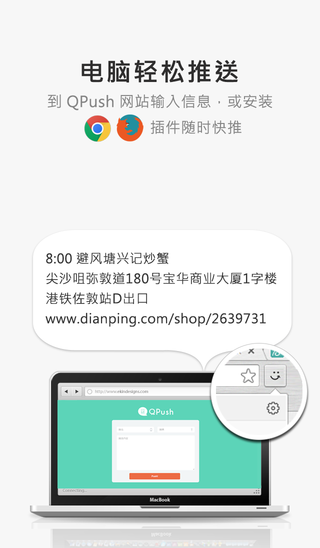 - 先访问快推的网站 qpush.me 下载自己相应浏览器的插件,目前提供了 Chrome / Firefox / Safari / IE 四种最常用的浏览器支持。