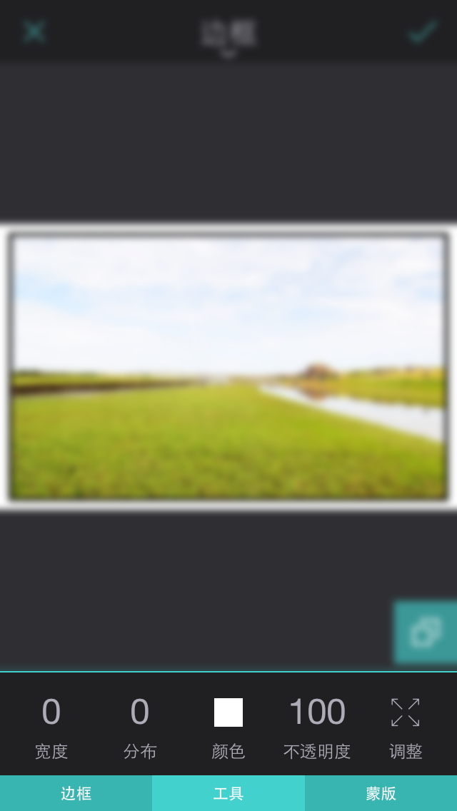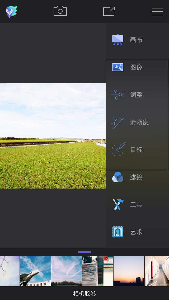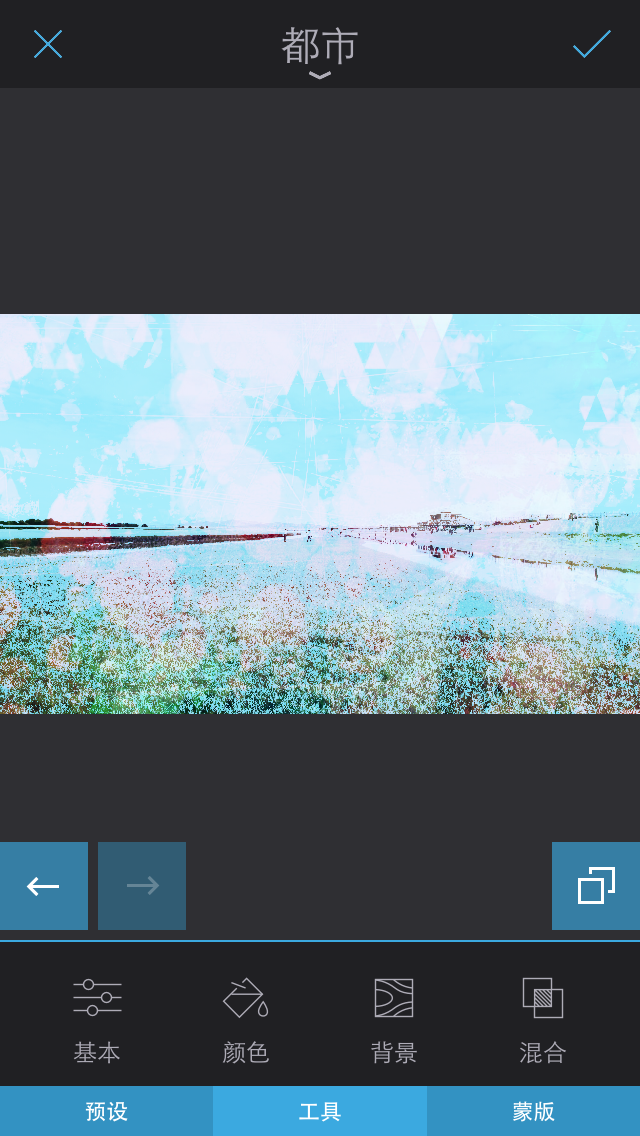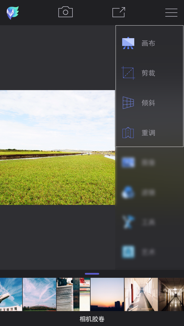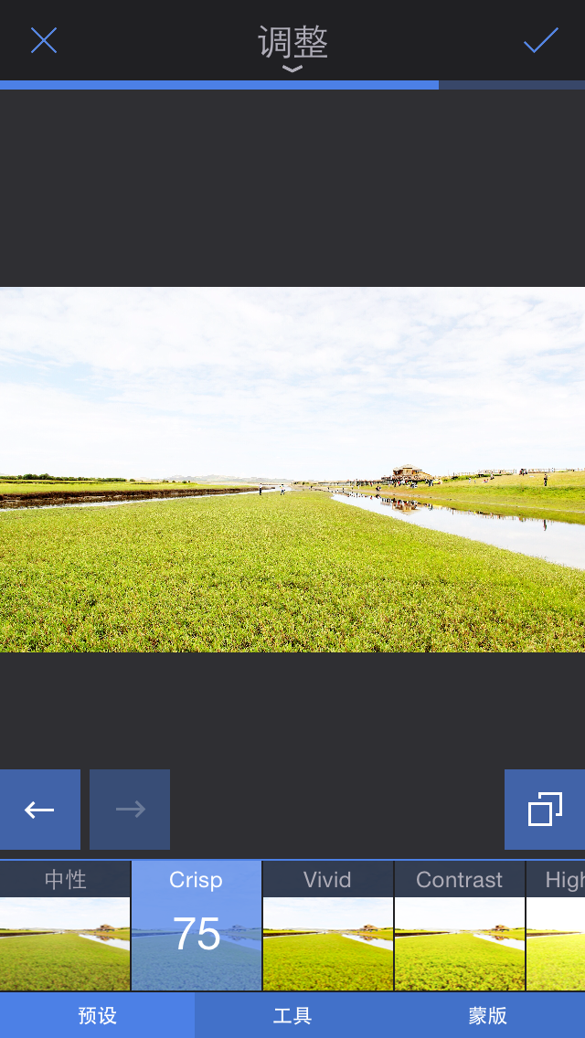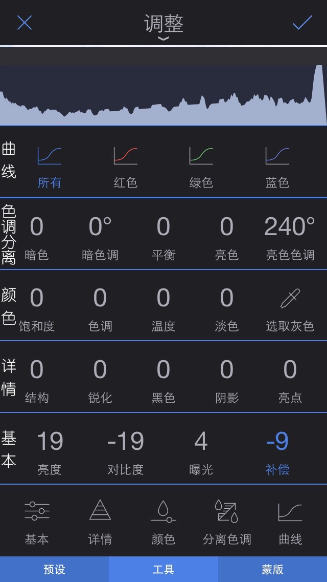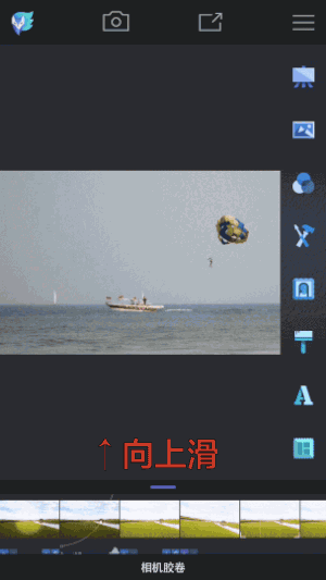 - 界面最下方的蓝色工具条是可切换的编辑选项,蓝色上部的灰色工具条则是相应选项的可调节参数,你可以将其选定为蓝色高亮时,在图片上左右滑动直接控制效果强度,并实时看到效果预览。