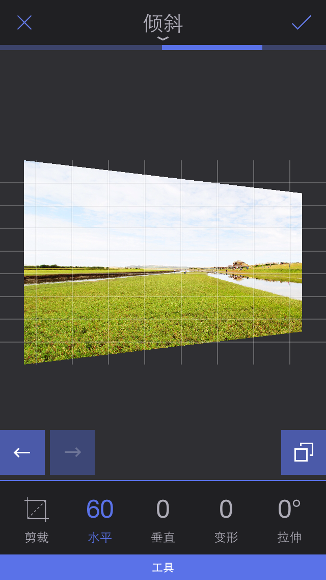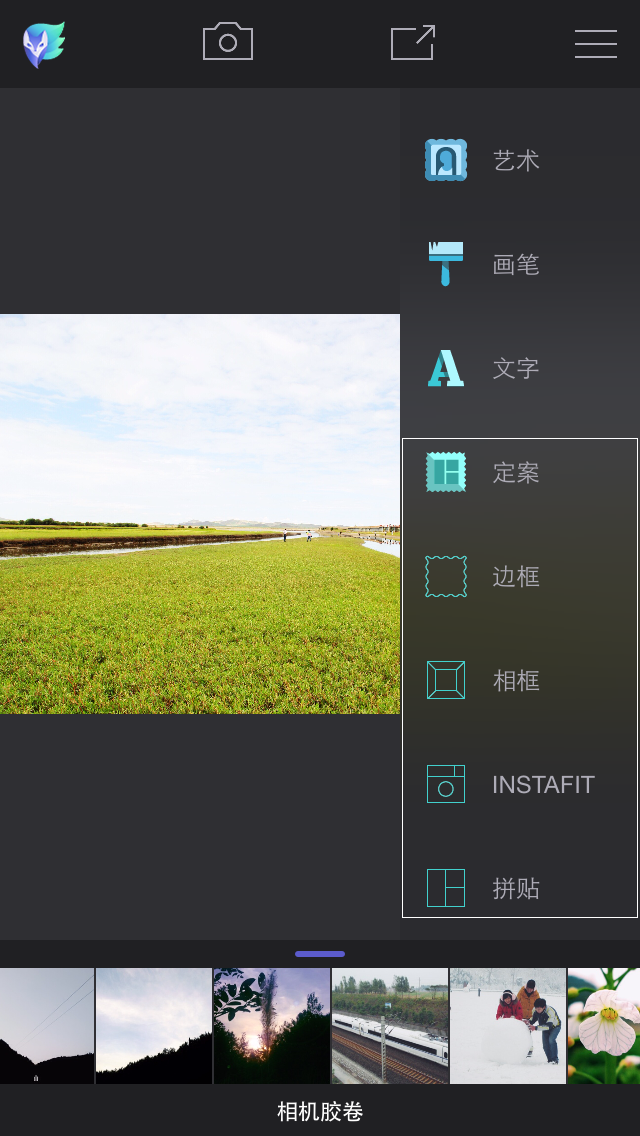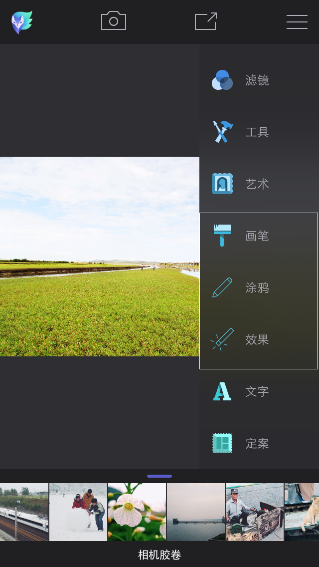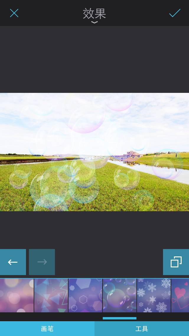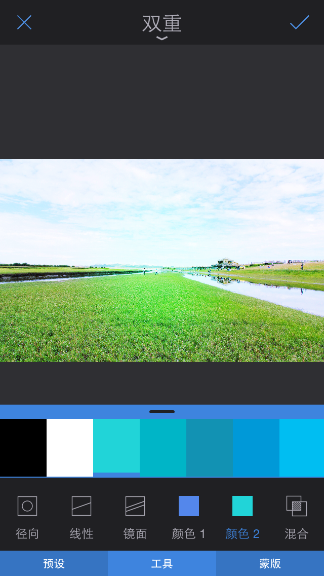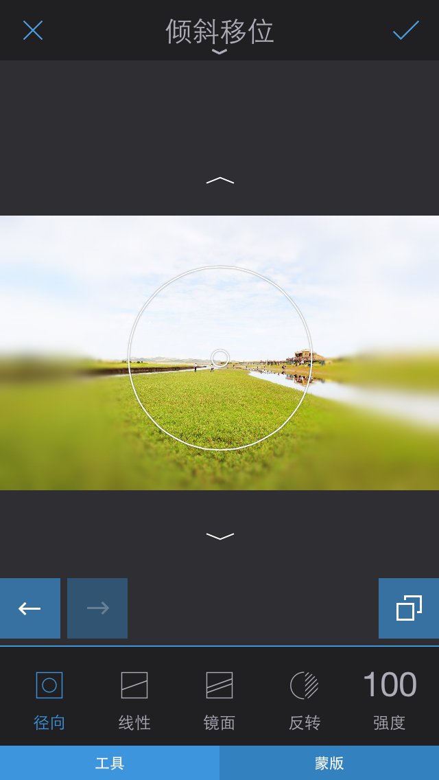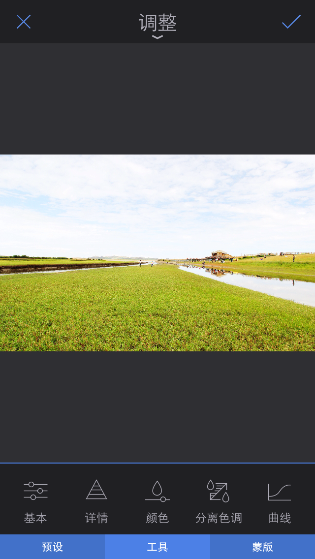 - 界面最下方的蓝色工具条是可切换的编辑选项,蓝色上部的灰色工具条则是相应选项的可调节参数,你可以将其选定为蓝色高亮时,在图片上左右滑动直接控制效果强度,并实时看到效果预览。