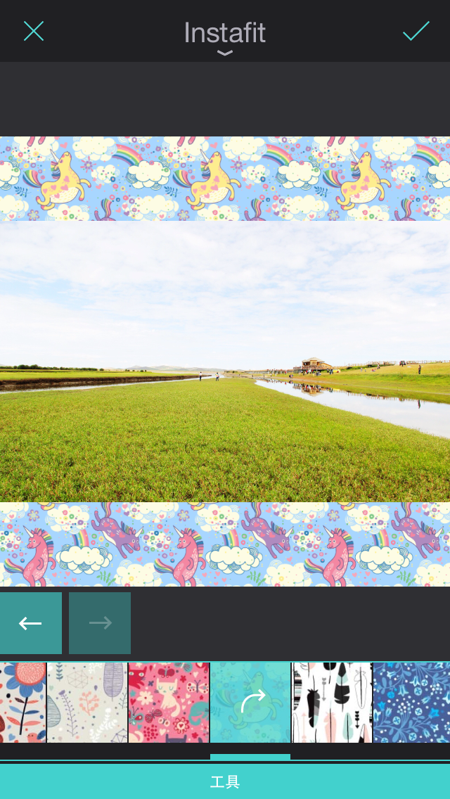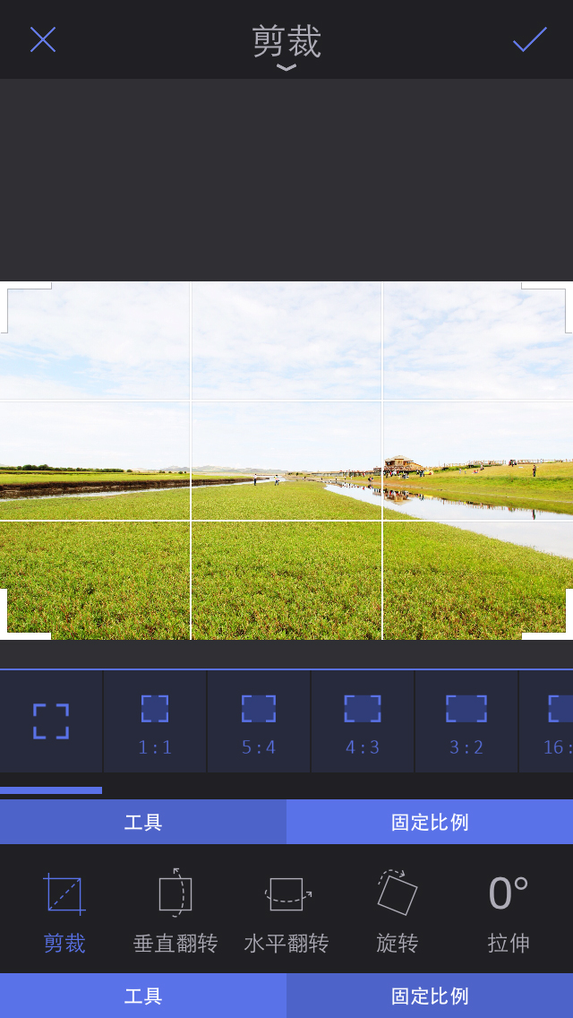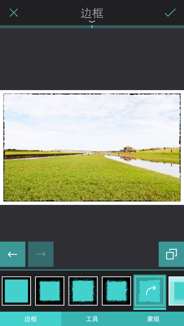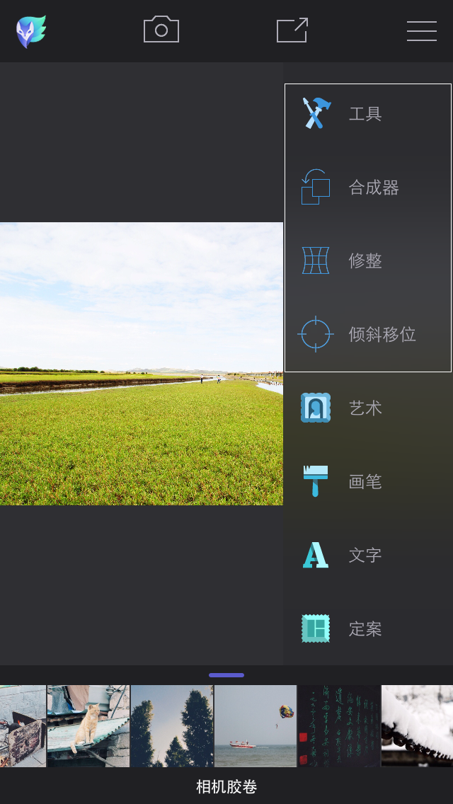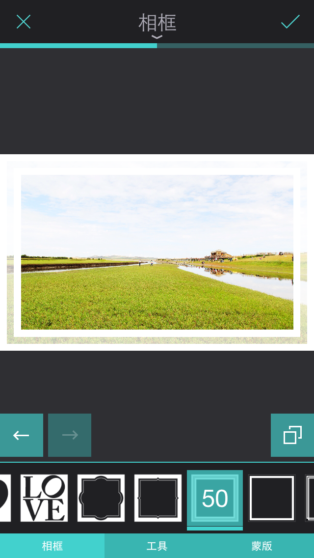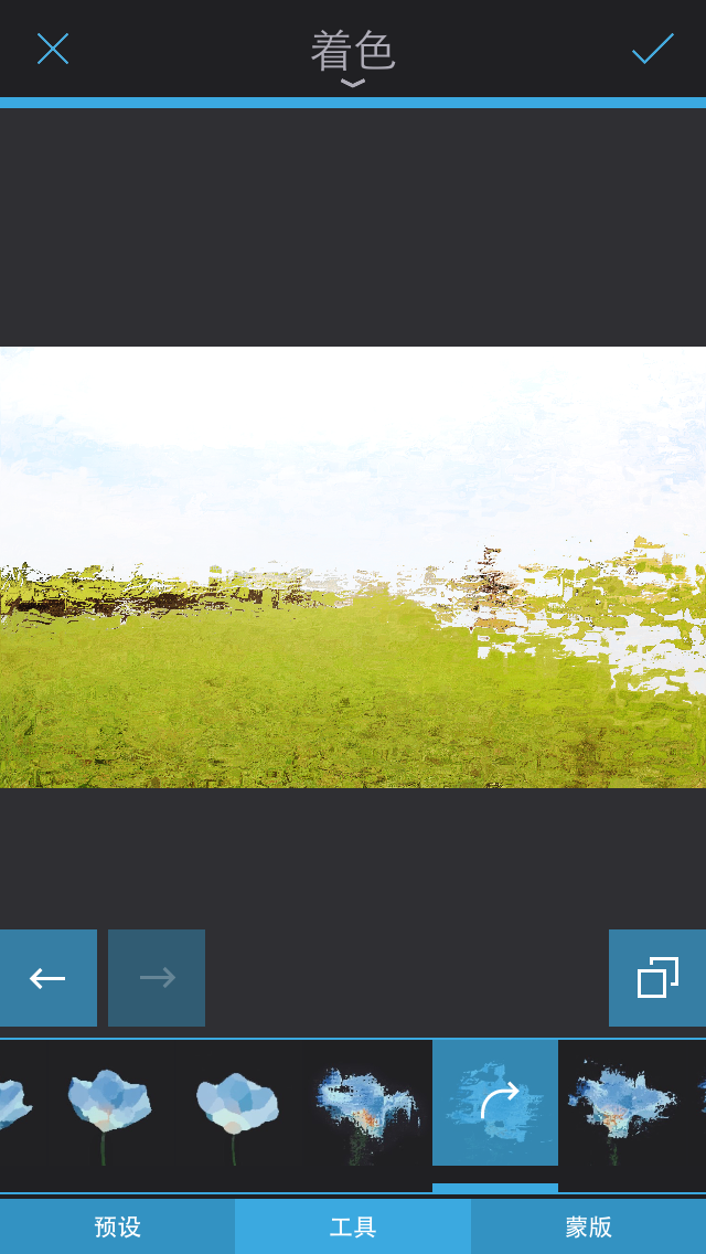 - 界面最下方的蓝色工具条是可切换的编辑选项,蓝色上部的灰色工具条则是相应选项的可调节参数,你可以将其选定为蓝色高亮时,在图片上左右滑动直接控制效果强度,并实时看到效果预览。