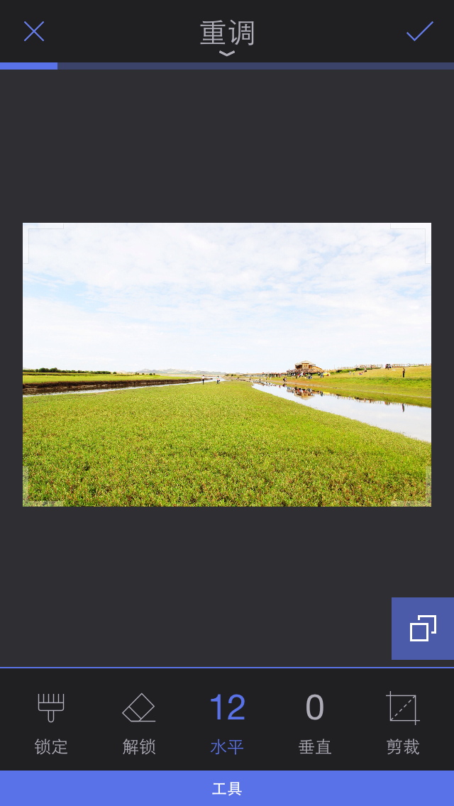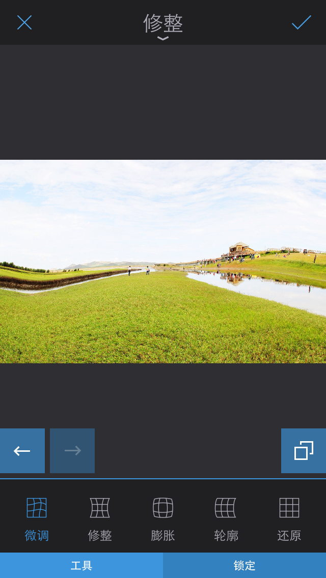 画布选项中包含了剪切、倾斜、重调功能。如上图所示,你可以使用这三个选项对图片做一个基本的调整,达到你需要的比例,画幅。 大部分基础工具在所有的图像后期应用中都包含了,重调功能却是 Enlight 的一大亮点,官方的演示动画把我惊呆了。你可以先锁定涂抹画幅中不需要移动的地方,再水平和垂直挤压、拉升照片,很实用。如下面的动图演示:
