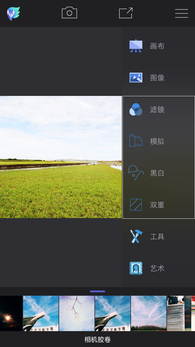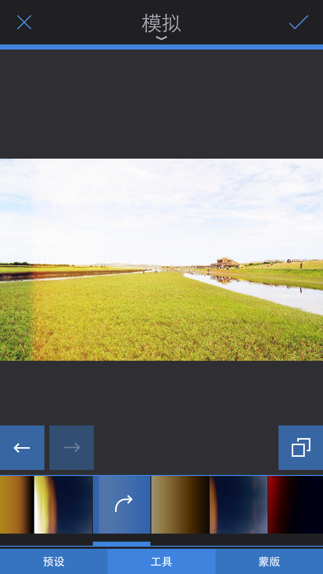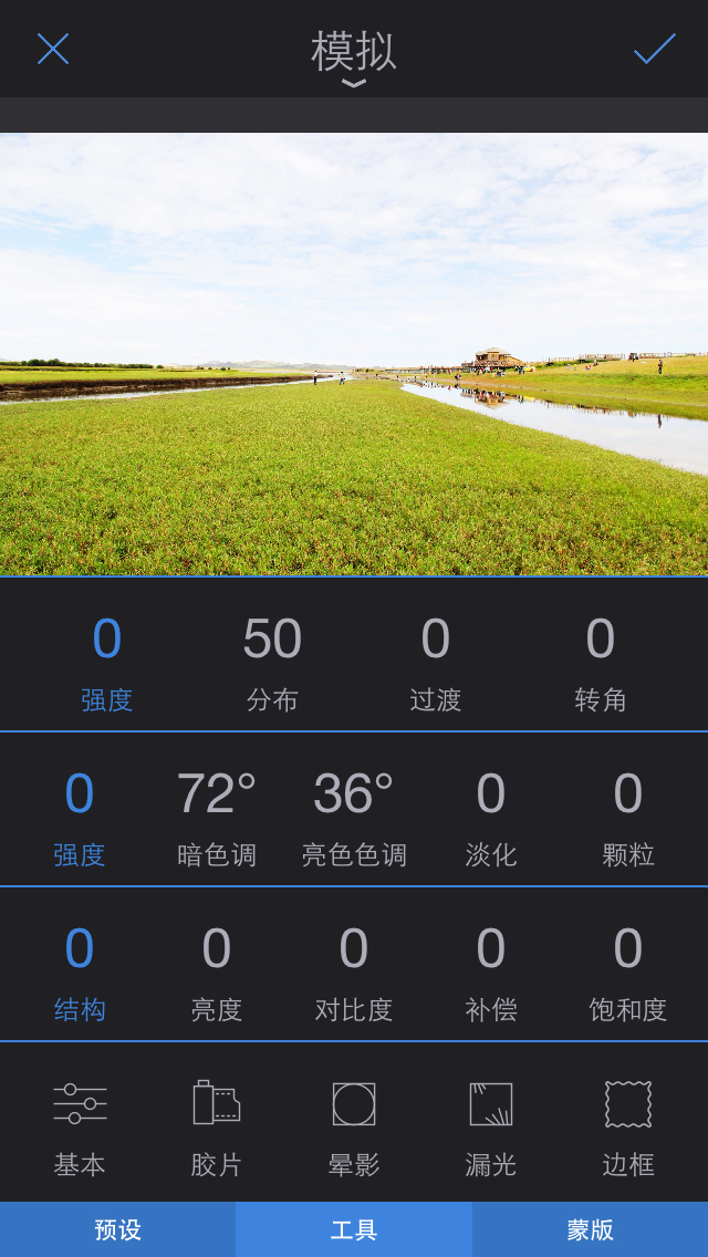 滤镜选项中包含着模拟(即模拟胶片的滤镜效果)、黑白、双重三个子选项。模拟工具如下(图二)所示,你可以根据自己的需求来实现很多效果。使用时,只需点击你要调节的工具,等待变为高亮蓝色时,在图像上左右滑动即可改变其效果强度,非常精确易用。