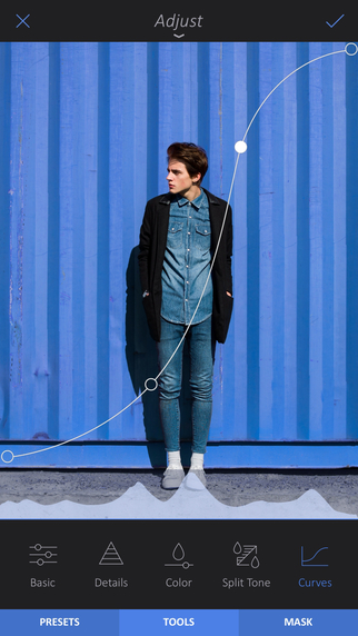 接下来的图像选项中可以更为精确、选择性控制色调、颜色和细节,甚至像曲线这样常见于专业图像处理软件上的功能 Enlight 上都包含了,你可以单击曲线新建一个控制点,选择好色彩区域拖动调节效果。其它使用数字化呈现的小选项都可以在选定为高亮蓝色后在图像上向左右滑动来调节其强度。