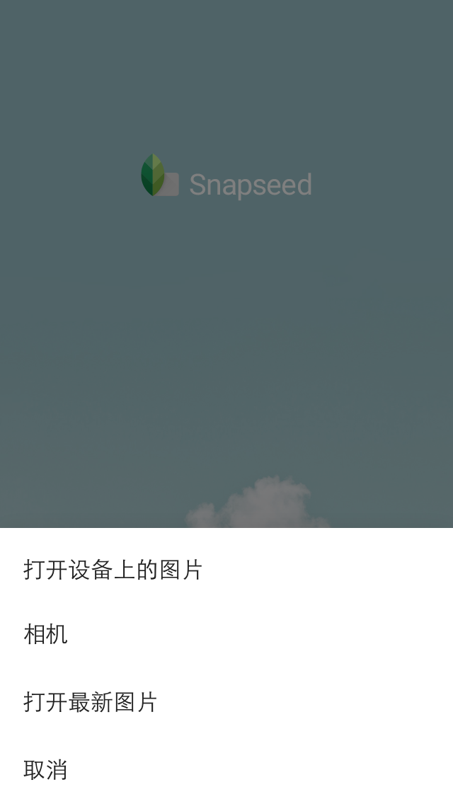 打开 Snapseed,只有一个选项,点击后可以选择你图库里的照片。如下方左图,还有极让我感动的「粘贴」和「打开最新图片」选项,在实际使用过程中十分方便。