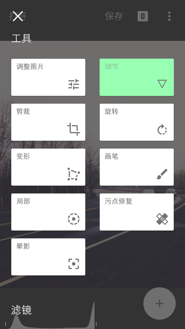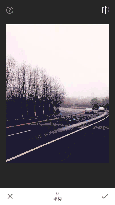工具包中的第二个选项是细节选项。顾名思义,细节选项即可以对图片进行细节增强处理,让主题更突出。在图片上垂直滑动即可选择结构或锐化。选择某个选项后,水平滑动即可精确修片。结构可以增加图片中的细节量。结构操作是采用一种独特算法,可突出显示整张照片中对象的纹理,同时不会影响对象的边缘。锐化可以增加图片细节的锐度量。编辑界面下部工具栏的数字指针会显示出精确的调整量。