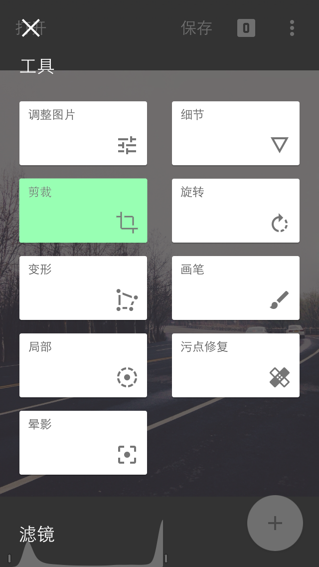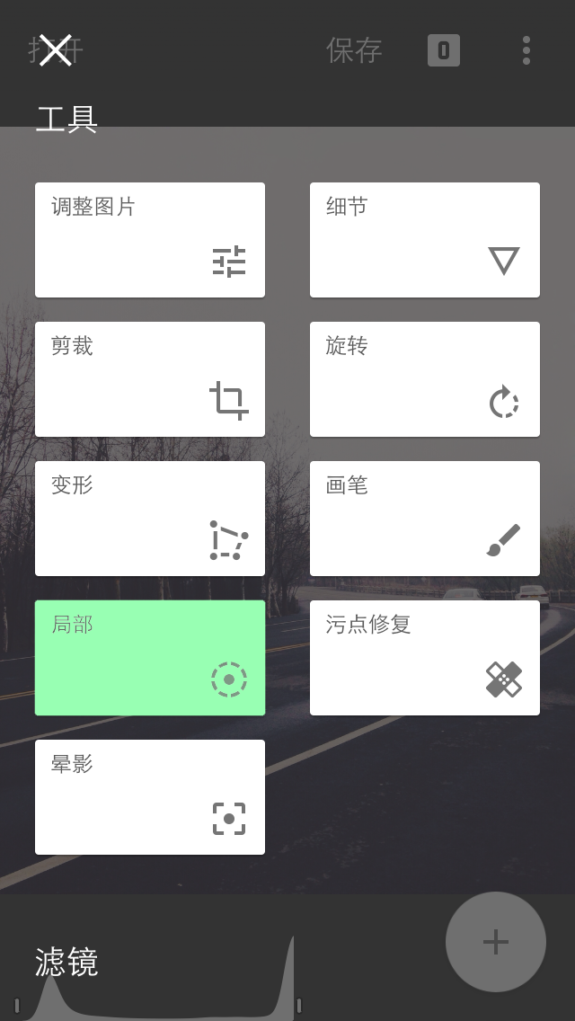 Snapseed 的第一个工具是调整图片。进入在调整图片的选项后,点按