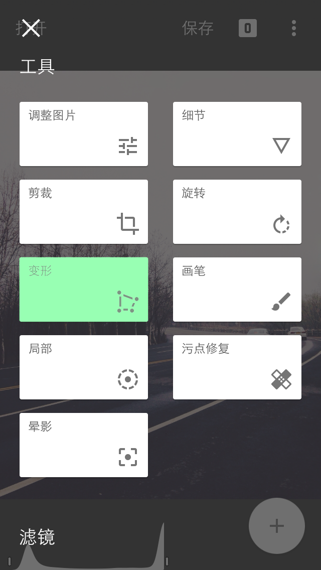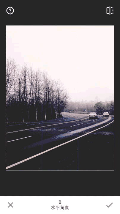 通过变形工具,可以自由的变换画幅的水平和垂直角度。由于变形工具可自动填充空白区域,因此无需剪裁边缘即可调整透视变形。在图片上垂直滑动即可访问编辑菜单。选择某个选项后,水平滑动即可修正调整。变形工具的二级编辑菜单还包括: