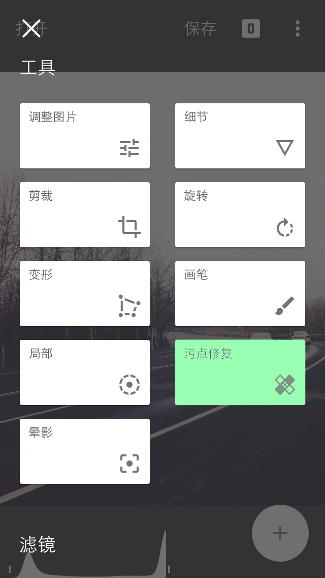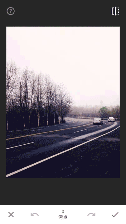 Snapseed 的污点修复功能和 Photoshop 中的污点修复功能相似,但是效果还是有一些差距,Snapseed 的污点修复只支持点操作,并不支持涂抹修改。点按不需要的污点即可将其消除。点按