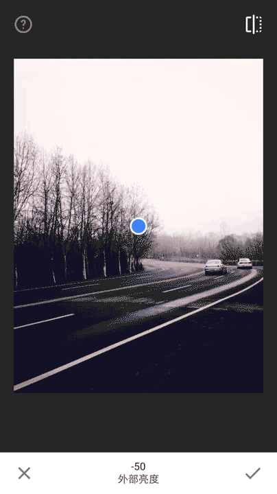 如果你刚刚听到晕影还不知道它的准确用法,那么我就告诉给你。通过添加晕影是一种强调画面主题的强大方式。点按蓝点并将其拖动到图片的主要突出部分上。使用双指张合手势扩展或限制晕影的中心大小。在图片上垂直滑动即可选择外部亮度或内部亮度,然后水平滑动即可完整调整。另外: