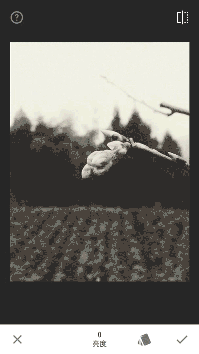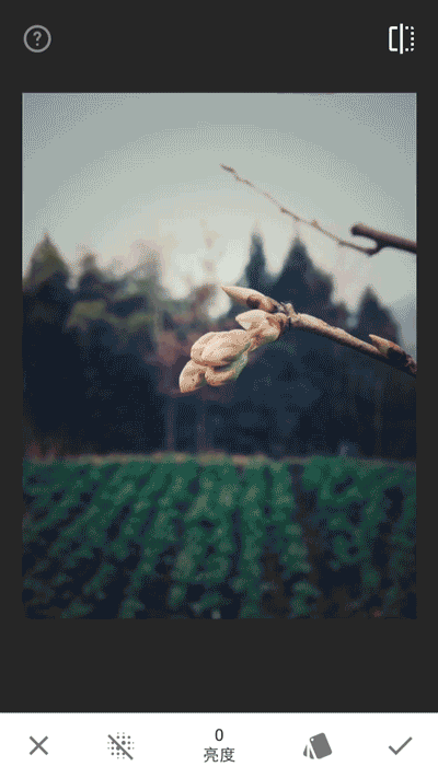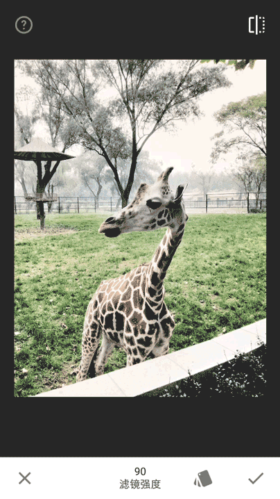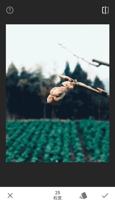 即可选择滤镜风格。然后,垂直滑动即可调整滤镜强度或饱和度。选择某项后,水平滑动即可修片。该滤镜的垂直菜单还包括: