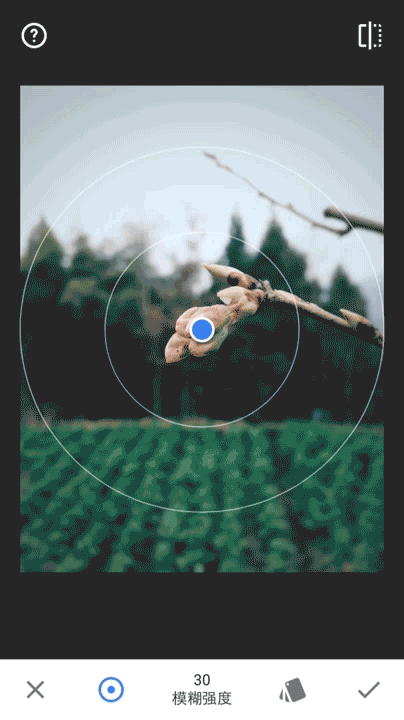 - 晕影强度:向右滑动可调暗图片的边缘,并在模糊效果中融入晕影。