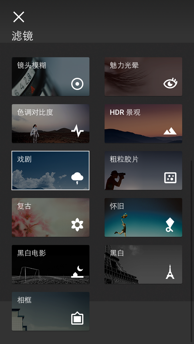 戏剧滤镜可以给你所拍摄的照片立即添加细微修片和强烈的艺术效果等戏剧风格。点按