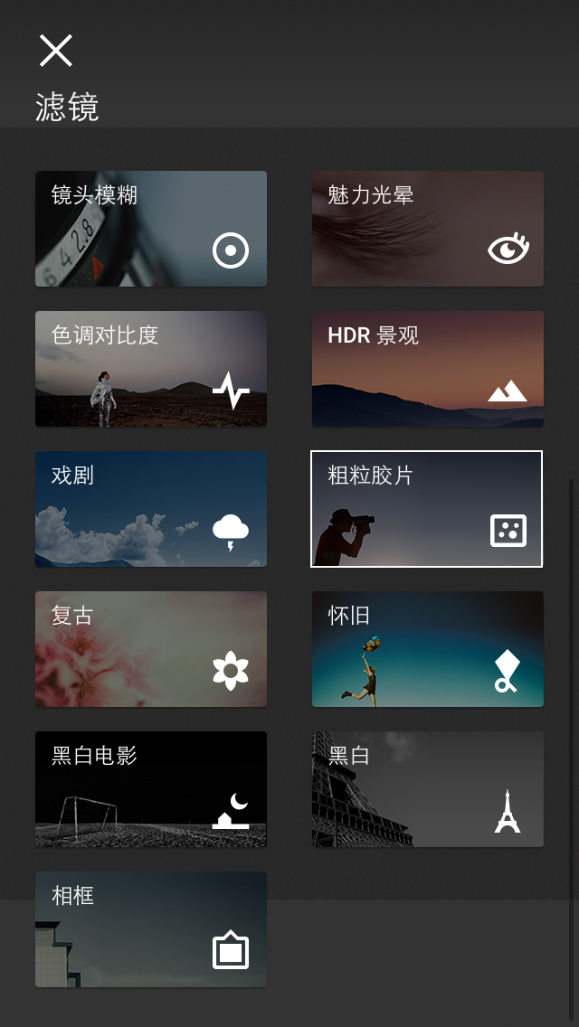 接下来的粗粒照片滤镜可以利用颗粒引擎的逼真效果复制彩色胶片上的拍摄效果。点按