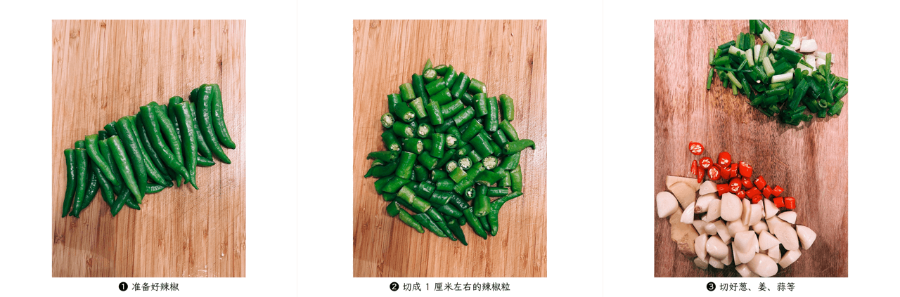 切好之后,可以加入少许生抽、胡椒粉、料酒腌制。切忌料酒不宜过多,否则很容易会有料酒的气味残留在菜品内。切完鸡肉之后,青椒的处理同样是 1 厘米左右的辣椒段,而葱姜蒜等辅料切碎即可。